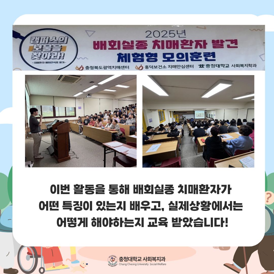 흥덕구보건소 치매안심센터가 충청대학교 사회복지과에 뜻깊은 행사와 함께 찾아왔습니다! 사회복지과 전학년을 대상으로 배회실종 치매환자 특강 및 파트너교육을 진행하고 일주일 동안 모의훈련을 통해 학생들이 실제상황에서도 힘을 쓸 수 있도록 했습니다 이번 활동을 통해 학생들이 사회에서 생활하며 시야를 넓히고 배운 것들을 실천하면 좋을 것 같습니다! |