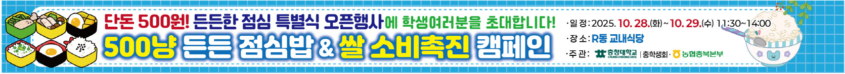 2025년 「500냥 든든 점심밥 & 쌀 소비촉진 캠페인」 행사에 학생여러분을 초대합니다. 재학생 여러분들의 많은 참여와 이용 바랍니다. 세부내용은 첨부파일을 참조해 주시기 바랍니다. |