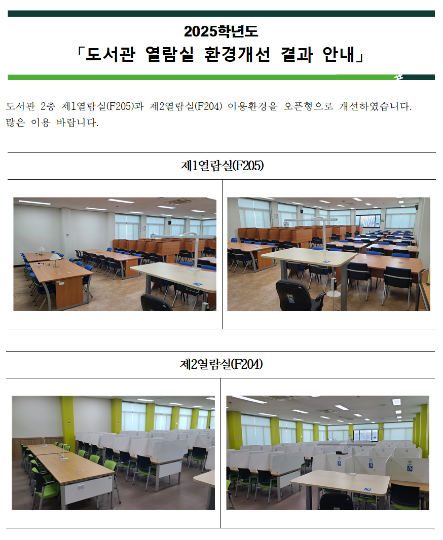 학생공지 학생공지 일반공지 장학/학자금 공지 감염병안내 공모/모집/시험 도서관 생활관 기부금공개 업무추진비공개 보육교원연수원 기타공고 충청대학교_대표-학생공지(대표_충청마당_공지사항_학생공지) 상세보기 - 제목, 내용, 파일, 작성자, 조회수, 작성일, 학과공지, 주소링크 정보 제공 【도서관】 열람실 환경개선 안내 작성자 : 강희진 작성일 : 2025-11-26 조회 : 128 열람실 환경개선 안내 파일 png 문서 2025 도서관 열람실 환경개선 안내_20251125.png 주소링크 https://clis.ok.ac.kr/#/bbs/notice/1400 목록 게시물삭제 광고 반복작성 욕설 본인삭제 게시물삭제 다음글 【도서관】 2025년 전자자널 DBpia 온라인 실시간 이용 교육 안내(6차)